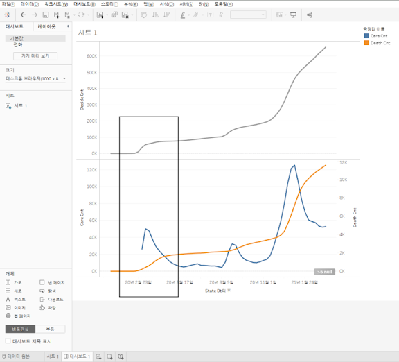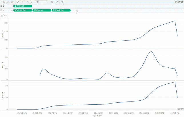 이제 확진자(Decide Cnt) 외에 두개의 그래프(Care Cnt, Death Cnt)를 보조축을 만들어 겹치도록 하겠다.