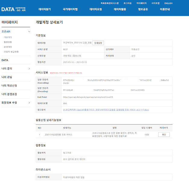 1.3) 활용신청을 진행 한 후 마이 페이지에서 해당 내용 상세보기 진행