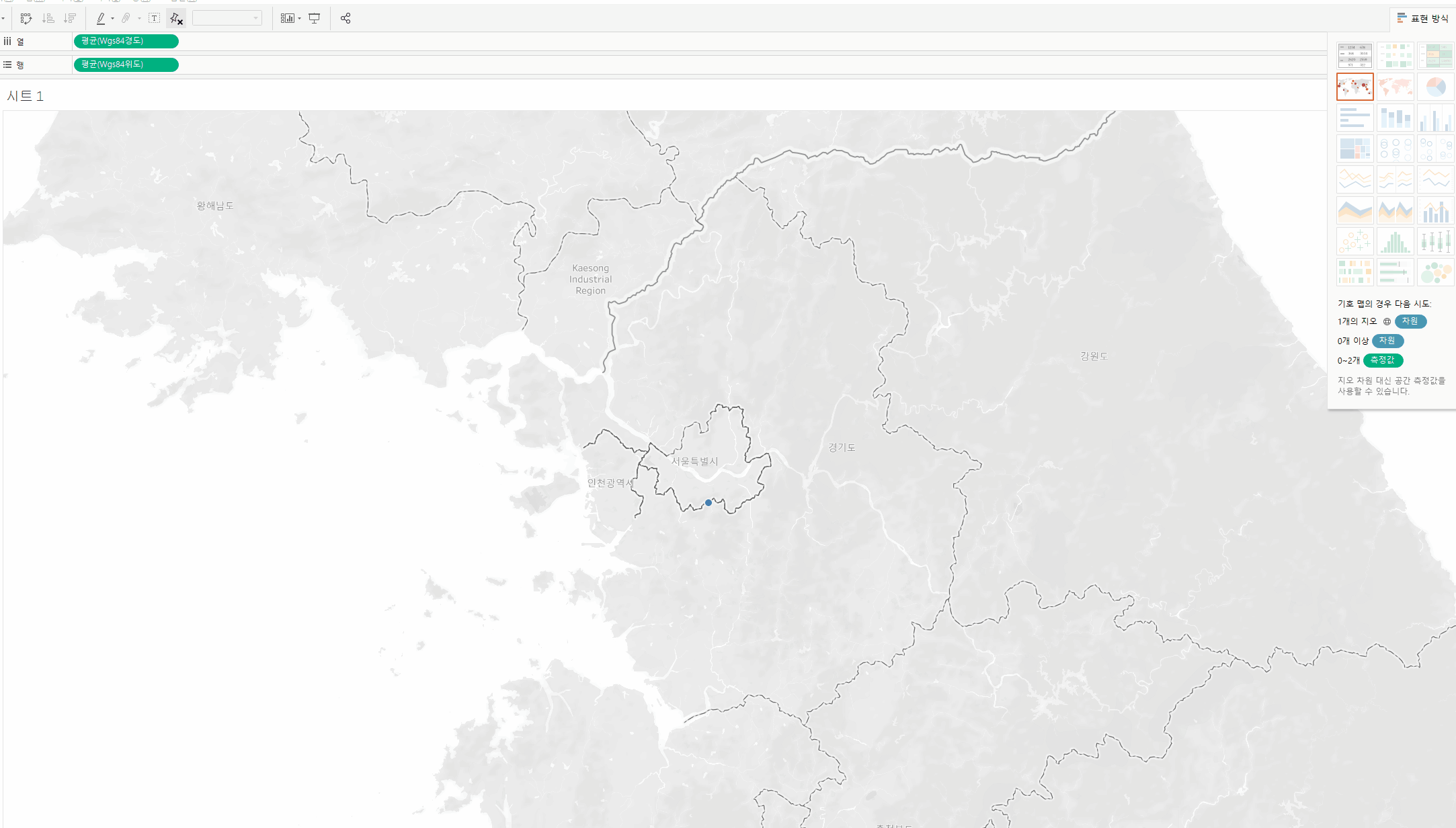변경한 위도와 경도 데이터를 클릭한 후 오른쪽 표현방식 탭의 지도를 선택하면 맵이 나타나면서 위치가 표시된다.