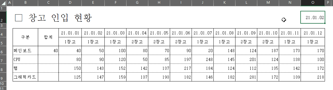 결과) 넣는 날짜에 따라 해당 일자의 '1창고'의 값이 나오게 됩니다.