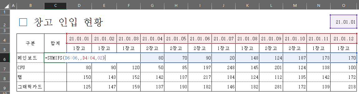 =SUMIFS(D6:O6,D5:O5,"1창고",D4:O4,O2)