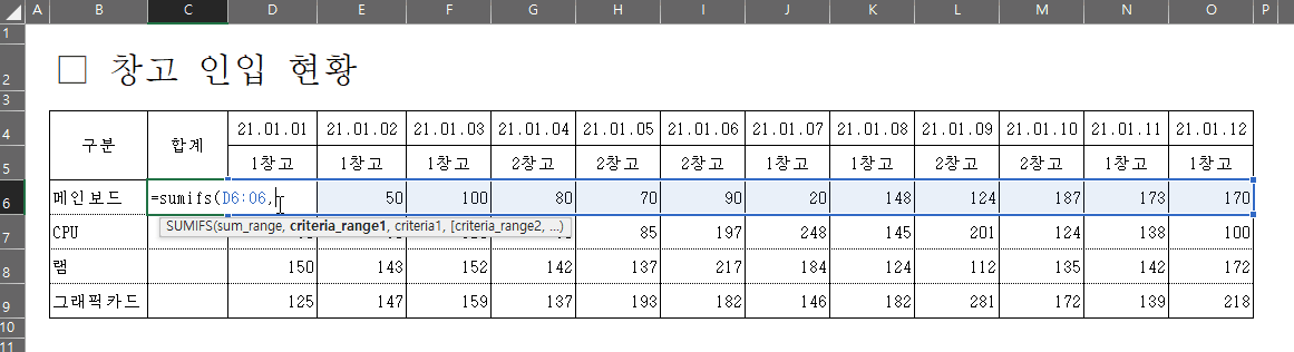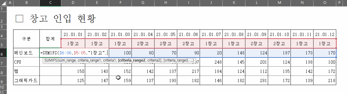 =SUMIFS(D6:O6,D5:O5,"1창고")