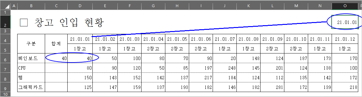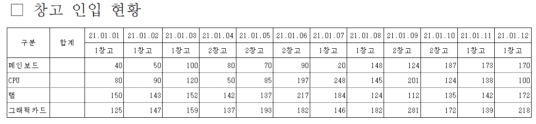 결과) 메인보드의 합계 중 '1창고'에 입고된 물량을 모두 집계할 수 있습니다.