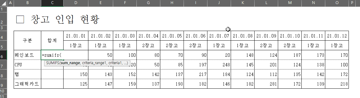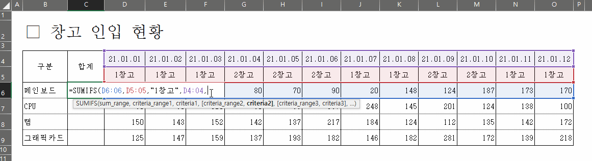 =SUMIFS(D6:O6,D5:O5,"1창고",D4:O4)