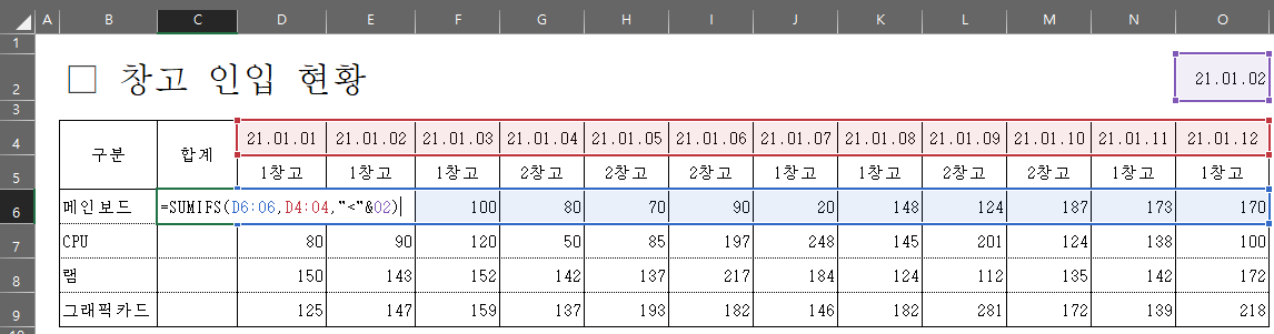 결과) O2에 들어가는 값보다 작은 날짜에 입고된 물건의 합이 지정됩니다.