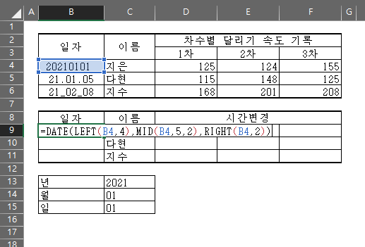 이 부분은 단순하게 DATE함수만을 쓰는 것이 아닌 문자를 잘라내는 LEFT, MID, RIGHT 함수를 모두 사용할 수 있어야 합니다.