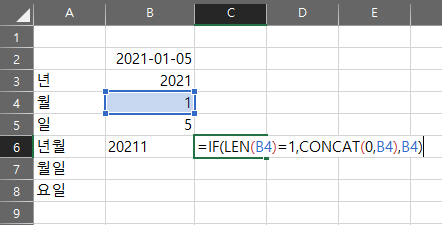 그런데 이렇게 붙이게 될 경우 월이 1로만 표시되기 때문에 만약 202101이라고 표현하고 싶다면 정상적으로 표현할 수가 없습니다.