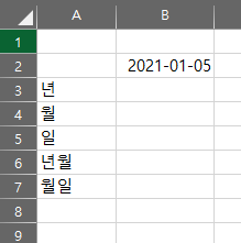 엑셀 표에 있는 것처럼 날짜 서식으로 만들어져 있는 값을 년, 월, 일, 년월, 월일로 표현하는 방법으로 설명드리겠습니다.