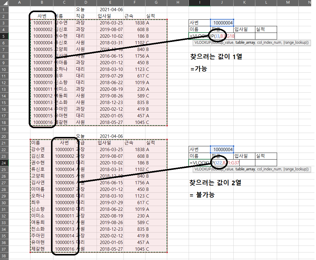 위에서 설명드린 찾는 값이 항상 1열에 있어야 한다는 것은 아래 그림을 보시면 좀 더 쉽게 이해가 되실 겁니다.