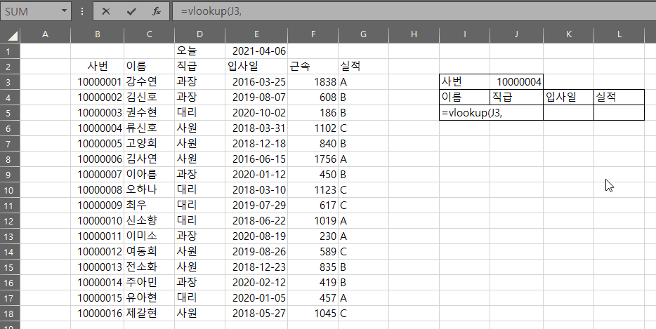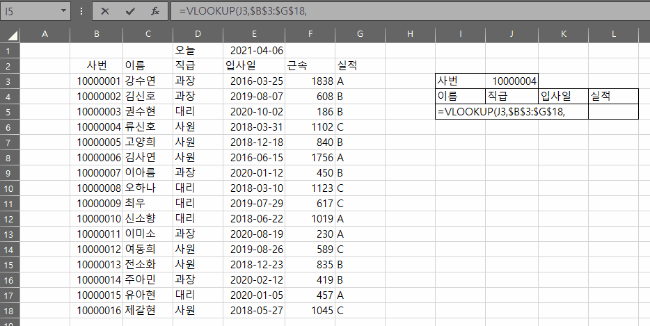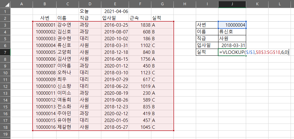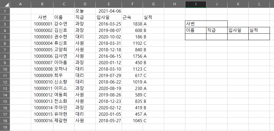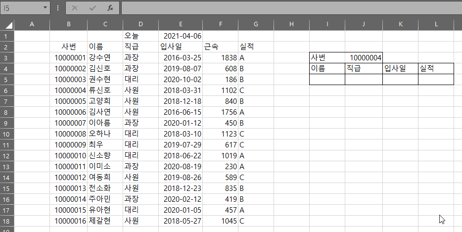 그 아래로 이름, 직급, 입사일, 실적에 자동으로 데이터가 채워지도록 하는 것입니다.