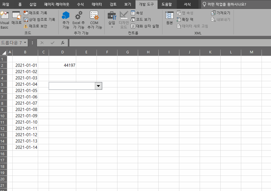 양식 컨트롤 중에서 콤보 상자를 선택해 줍니다.