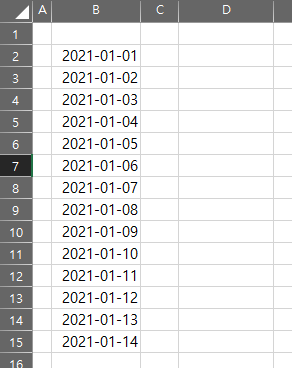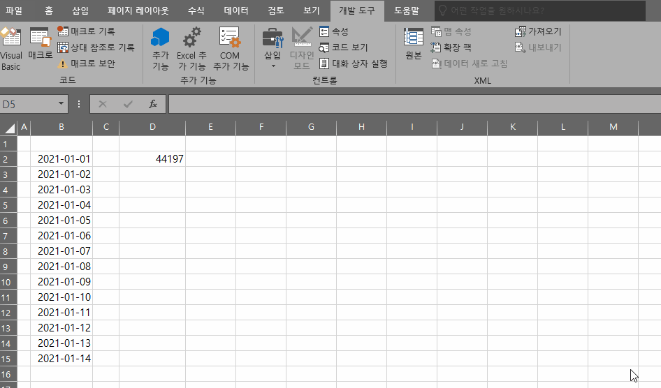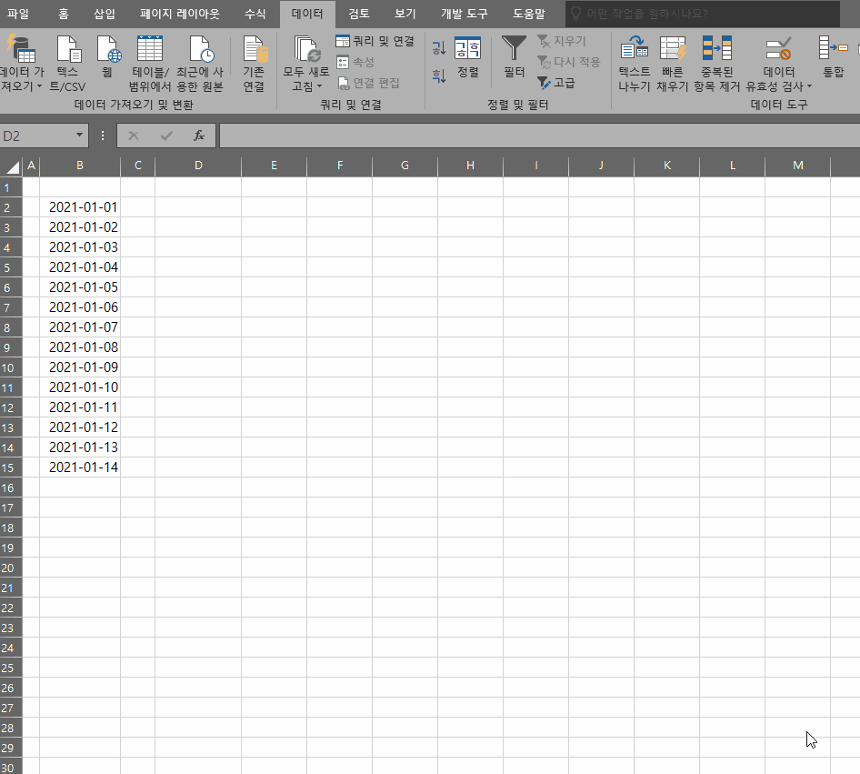먼저 사용할 데이터를 준비해주겠습니다. 가장 많이 쓰이는 날짜 데이터를 사용하기 위해서 간단한 데이터를 가져왔습니다. 여기서 D2 셀에 변동 데이터를 넣도록 하겠습니다.