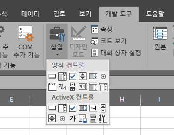이중 삽입을 누르게 되면 하단에 양식 컨트롤과 ActiveX 컨트롤이 나오게 됩니다.