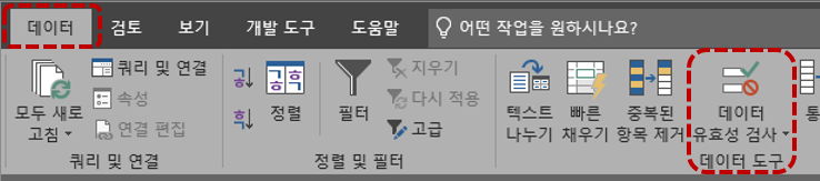 엑셀 탭 중에 [데이터] 탭에 가면 [데이터 도구] 탭 안에 [데이터 유효성 검사] 탭이 있습니다.