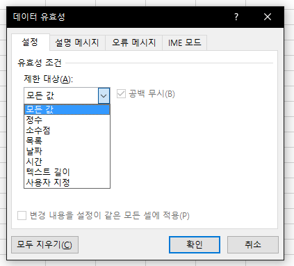 여기서 데이터 유효성 검사를 선택해주면 됩니다.