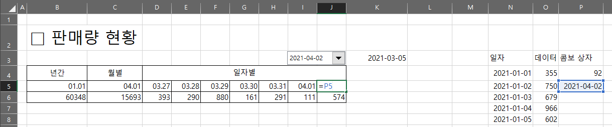 콤보상자의 셀 연결은 P4셀에 연결해서 해당 셀에 데이터가 들어가도록 합니다.
