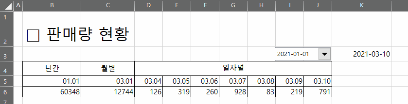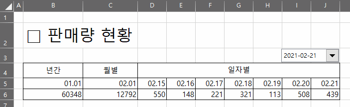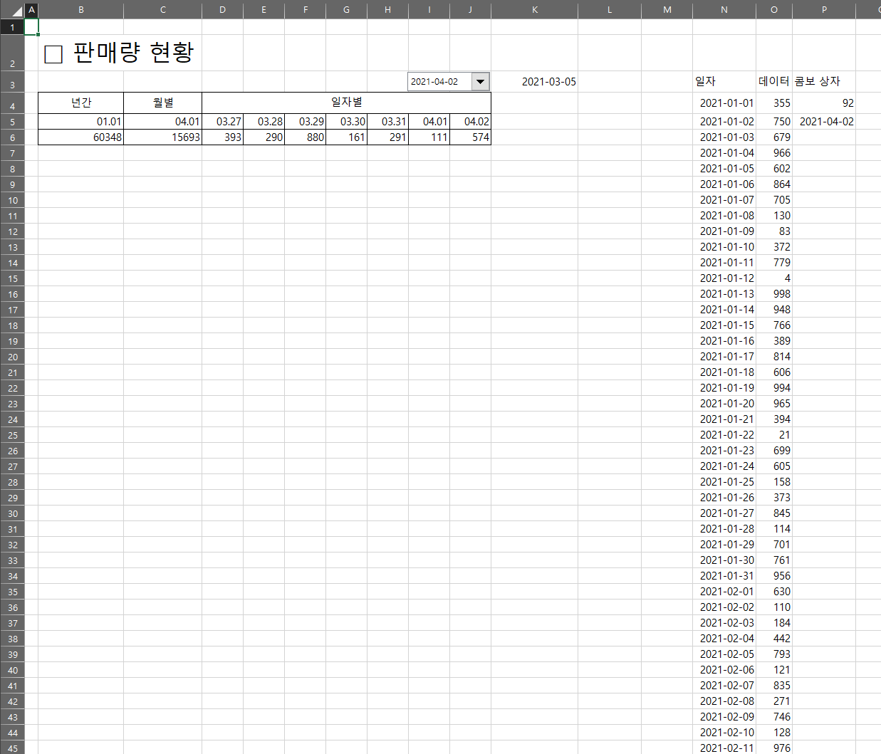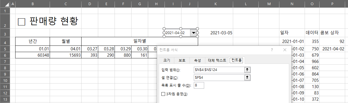 이것을 참조한다면 결과적으로 날짜 값만 콤보상자와 유효성 검사로 변경한다면 그 조건만큼 범위가 표기되도록 만들어 줄 수 있습니다.