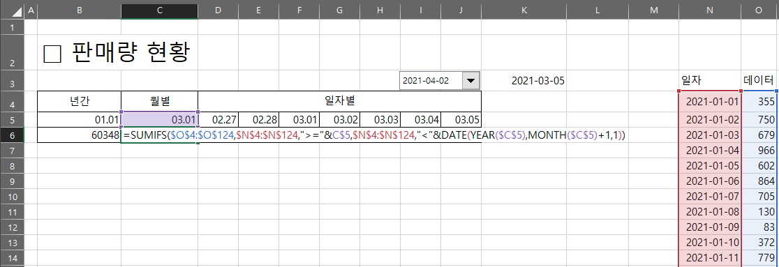 이렇게 해준 후 조건을 ( [해당 월의 1일] <= [값] and [다음 월의 1일] > [값] )으로 지정함으로써 항상 해당 월의 전체 데이터를 sumifs로 가져오도록 합니다.