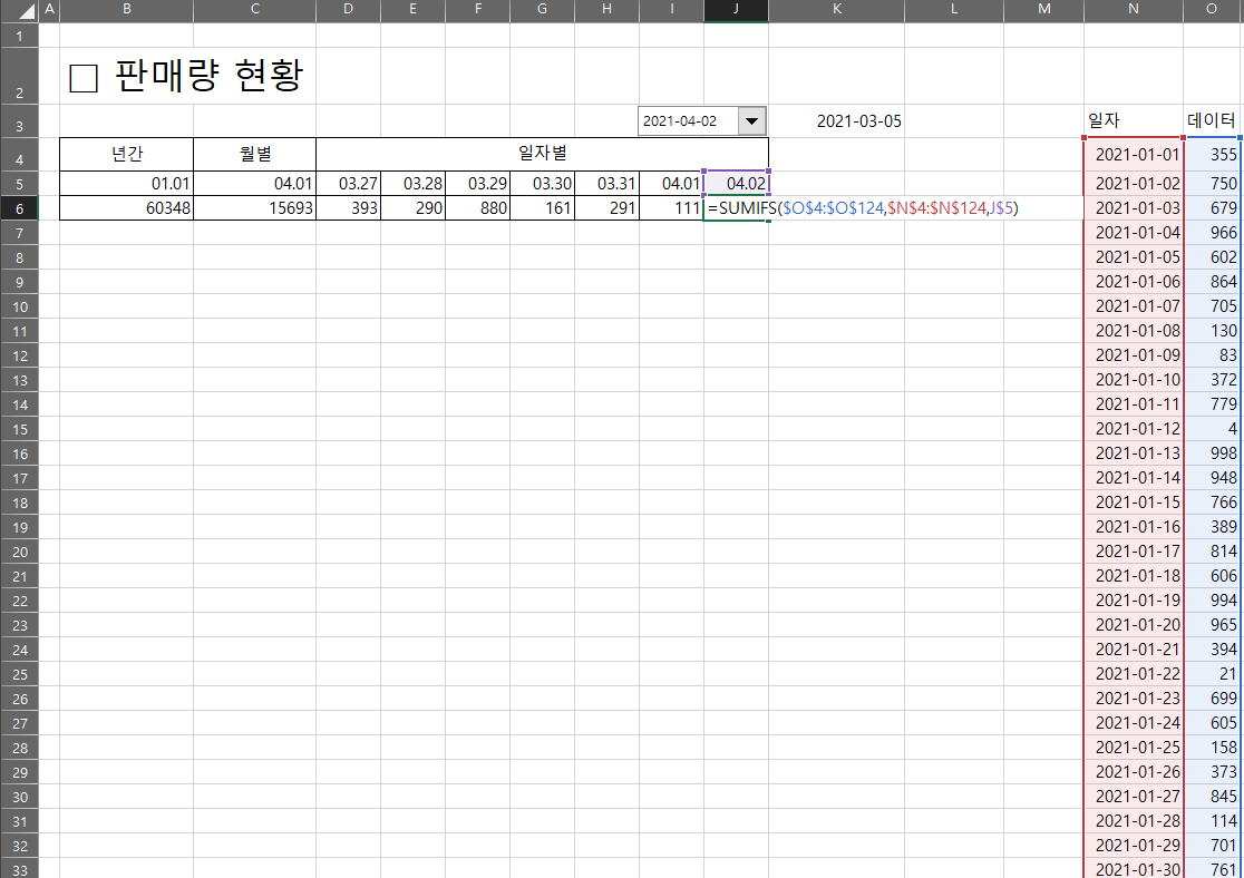 일자별 데이터를 표현하는 장소에 유효성 검사를 통해서 선택한 날짜가 나오도록 하고, 해당 날짜를 기준으로 모든 날짜를 깔아줍니다. 이후 해당 날짜를 기반으로 SUMIFS를 지정해주면 됩니다.