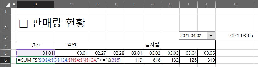 또한 SUMIFS를 통해서 기간을 지정해서 데이터를 가져오도록 했는데 이는 예전에 설명한 내용이 있어 해당 내용을 참조하시면 쉽게 만드실 수 있습니다.