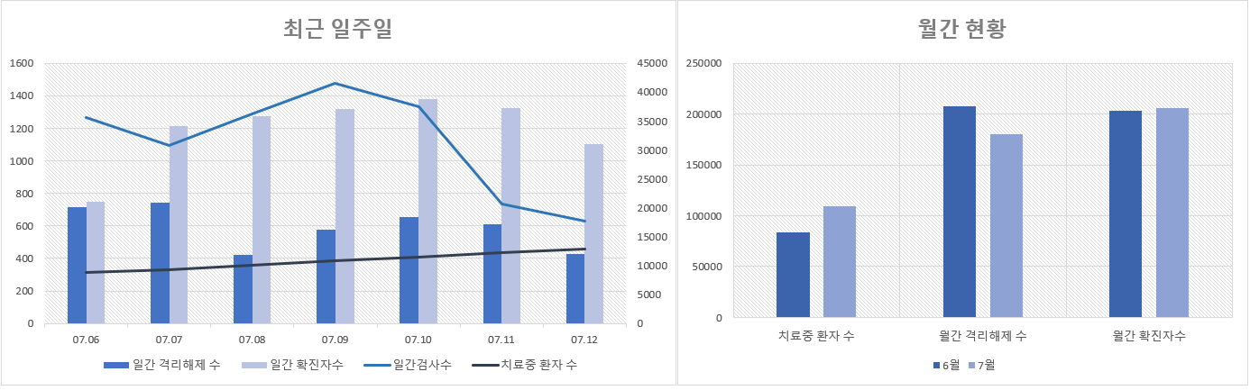 6월 12일까지의 누적 데이터와 7월 12일까지의 누적 데이터를 계산했을 때 치료 중 환자수가 증가, 격리 해제수는 감소하면서 동시에 확진자수는 증가하고 있는 것을 볼 수 있습니다.