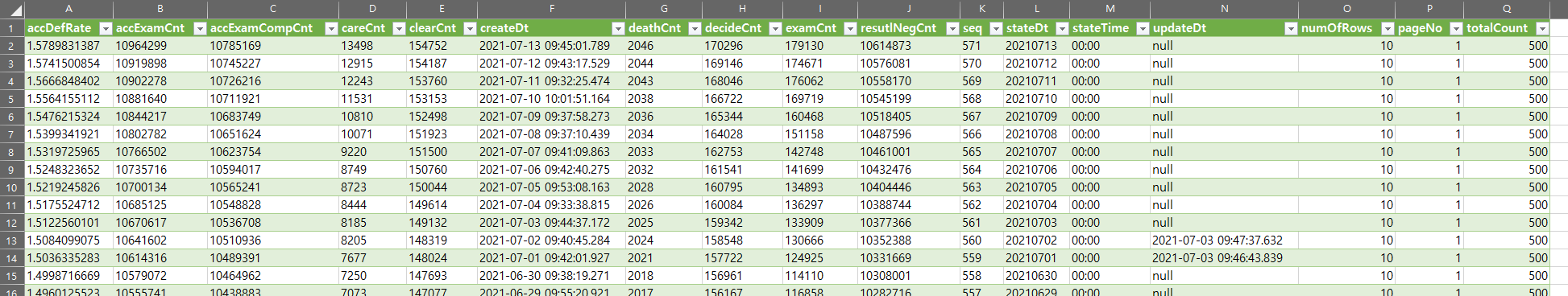 해당 파일의 작성일인 21년 7월 13일이다 보니 아래 보이는 것처럼 12일까지의 데이터가 자동으로 불러와졌습니다.