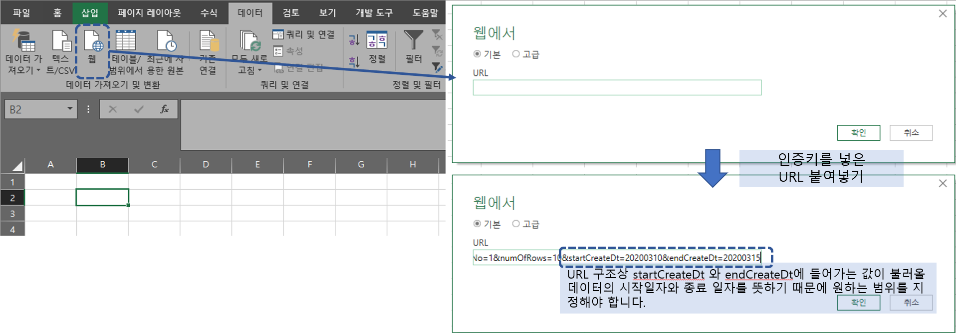 그럼 긴 링크가 만들어질 텐데 해당 링크를 엑셀에 [데이터] - [데이터 가져오기 및 변환] - [웹]으로 연결하면 됩니다.
