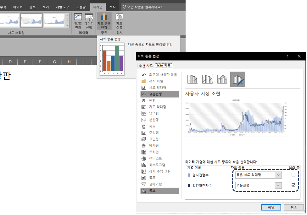 다만 데이터 값이 검사수와 확진자수는 숫자가 굉장히 차이 나기 때문에 데이터를 하나는 보조축으로 바꿔줘야 합니다.