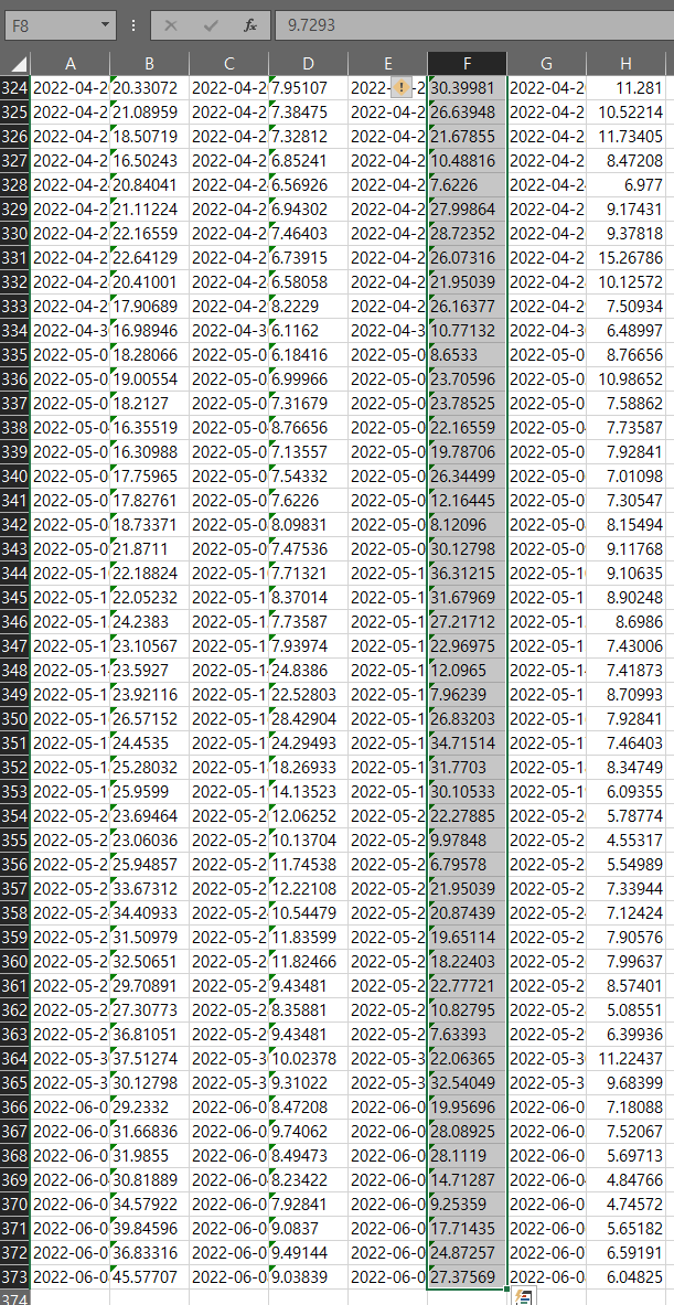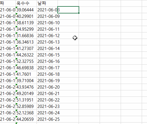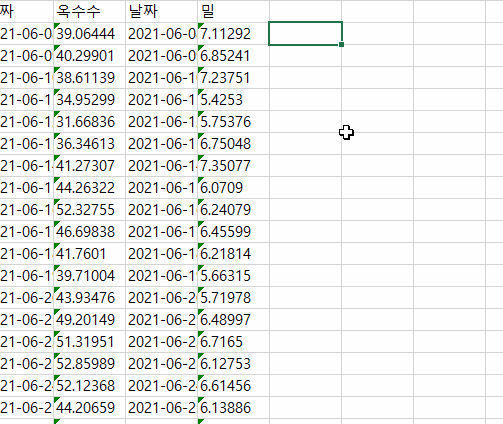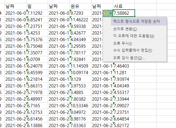 한 두개의 값이 이런 형식을 가지고 있다면 단순하게 오류 버튼을 눌러서 숫자로 변환을 해줘도 됩니다.