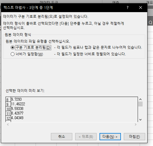 데이터에 있는 [텍스트 나누기]를 선택해줍니다.